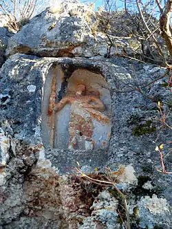 There are four figures; three soldiers and a woman. They are dated to Roman Empire era.[1] Each figure is about 1 metre (3 ft 3 in) tall and had been carved on the northern slope of a hill about 3 metres (9.8 ft) high with respect to ground.