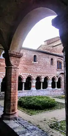 The cloister has columns and capitals in different styles. It has cycle of frescoes with Christ between the Symbols of the Evangelists, the Adoration of the Magii, a Dead Man in Red Toga and Contrast between Three Dead and Three Living Men, the latter perhaps a representation of the legend of Charlemagne.