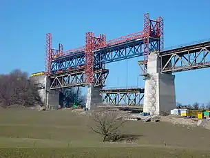 In order to minimize disruption to traffic, the steel bridge-deck sections were assembled off-site, directly beside the rail-freight marshalling yard at Montzen, and then transported the few kilometers to the bridge in order to be positioned using a specially prepared overhead crane structure (see picture). This exercise was undertaken, two deck-sections at a time, at approximately eight weekly intervals during a weekend "window" when the line was closed to traffic. Once the new bridge-deck had been completed, and the permanent replacement track laid the next year, the speed limit on the bridge was raised from 20 km/h (12 mph) to 60 km/h (37 mph).[1]