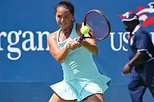 Kužmová is most known for her fast and aggressive style of play.[78] She is also talented striker of the ball. She has the ability to create easy pace off both wings, which makes her hard to play against as she presents problems from both sides.[79] Despite growing up on clay as only surface available in her hometown Košice, she prefers hardcourt. There, with her strong serve, she is able to win many points but she also enjoys playing on other surfaces, especially grass.[80]