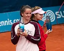 2019 was also successful for Kužmová in the doubles. She reached three WTA doubles finals. The most significant one is Premier-level St. Petersburg Trophy, where she partnered with Anna Kalinskaya and lost to Russian combination Gasparyan and Ekaterina Makarova.[48] However, she won another two finals, two International-level ones. First, in May, she won the Prague Open alongside Kalinskaya defeating Nicole Melichar and Květa Peschke.[49] Then, in July, she won the Bucharest Open final, this time with Kristýna Plíšková. They beat Romanian combination Jaqueline Cristian and Elena-Gabriela Ruse.[50] On 4 February 2019, after reaching the final in St. Petersburg, Kužmová debuted in the top 100, at world No. 94. And on 9 September 2019, after reaching semifinals at the US Open, she entered the top 30 for the first time.[16][51]