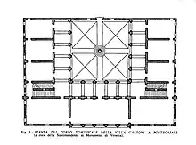 The villa is located in an irregular plot surrounded entirely by a wall; the main facade is positioned to the south and access to the property has a large gate, on the sides of which are two pillars surmounted by statues, which opens onto an avenue to the entrance.[2] The villa is arranged with loggias on three sides.[1]