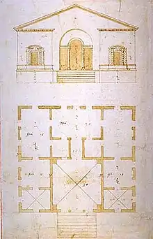 The villa was constructed during the 1540s, and is one of Palladio's earlier works.[1] It was commissioned by two cousins of the Valmarana family. The layout of the rooms suggests that Palladio's mandate was to provide accommodation for two nuclear families. The design also shows the influence of buildings from antiquity, which Palladio had seen on his first visit to Rome in 1541. The villa is decorated with frescoes, some of which date from the 16th century; they are more or less contemporaneous with the original occupation of the building.