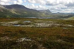 The reserve has many wetlands usually in subalpine regions. This is overwhelmingly aapa bogs, also called corded bogs, because of the form taken by these marshes. The main plants growing there are Sphagnum, sedges and willows, however there are also some peat dwarf birches, hare's-tail cottongrass (Eriophorum vaginatum), heather shrubs (Calluna vulgaris), bog blueberries (Vaccinium uliginosum) and cloudberries (Rubus chamaemorus) [A 8][10]
