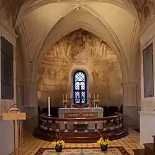 The apse of the church is decorated with medieval paintings. These date from the construction period of the church and were probably made by an artist from Lombardy, who may have come to Scania to work at the construction site of Lund Cathedral. The murals depict Christ in Majesty, Cain and Abel and a row of saints. There is also a scene which has been interpreted as the martyrdom of Saint Vincent (a popularly venerated saint in Scania at the time) or the burial of Saint Stephen. These paintings are some of the earliest church murals in Sweden.[1][2][3]