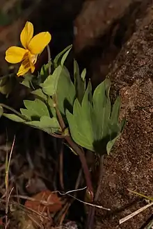 Viola lobata is a species of violet known by the common name pine violet. It is native to western North America from southern Oregon through California and into northern Baja California, where it occurs in mountain ranges and foothills. It grows in woodlands and other habitat. This rhizomatous herb produces an erect stem a few centimeters tall or growing to nearly half a meter in maximum height. The leaves have variously shaped blades borne on long petioles. The blades are 5 to 15 centimeters wide and may be hairless, hairy, or waxy in texture. The leaf blades are often divided into narrow lobes or dissected into small segments. The shape of the leaf blade differentiates the two subspecies; ssp. lobata has dissected leaves and ssp. integrifolia has entire or toothed blades. A solitary flower is borne on a long, upright stem. It has five yellow petals, all five or just the lower three with purple or brown veining and the upper two stained with purple or brown on the outer surfaces.
