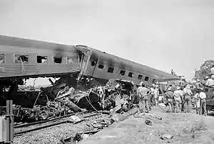 Shortly before 7 a.m., the trains collided head-on at a closing speed later estimated at 172 km/h (107 mph).[10] According to Brendecke (who survived his fall from the cab and the subsequent crash), as well as motorists on the adjacent Hume Highway, the force of the collision propelled the locomotive of the Southern Aurora, and several of the goods wagons, into the air.[9] Six of the passenger carriages were derailed, and one was completely crushed by other wreckage.[11] The two leading carriages telescoped into the rear of the locomotive, and two others rode over the top of the wreckage, suspending them some 30 ft (9 m) in the air.[12]