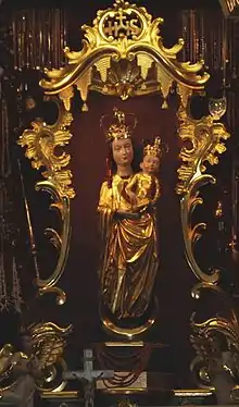 The Virgin of Kębło (Polish: Matka Boska Kębelska) is a medieval sculpture of the Madonna and Child, located in the shrine in Wąwolnica. The statue was brought to Wąwolnica from the nearby village of Kębło, hence its name.