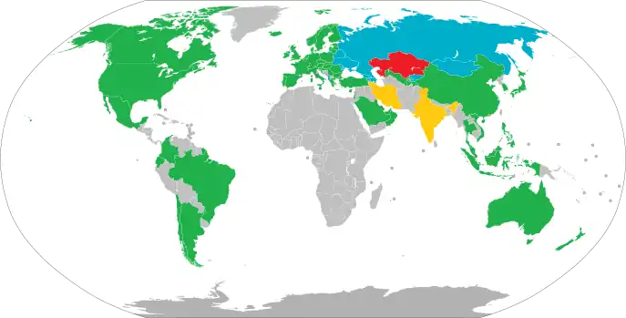 Citizens of the following countries may enter Kazakhstan without a visa for 30 days as part of a visa-free policy for countries with the large foreign direct investment in Kazakhstan's economy. These visitors can stay for a maximum of 90 days within any 180-day period (counted from the first entry).[4] The program was initially started on 15 July 2014 providing unilateral visa free access to 10 countries and in July 2015 it was further extended to a total of 19 countries, then to 43 in January 2017 and to 54 in September 2019.[5][6][7][8][9]