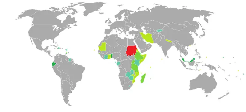Visa requirements for Sudanese citizens are administrative entry restrictions by the authorities of other states placed on citizens of Sudan. As of 2 July 2019, Sudanese citizens had visa-free or visa on arrival access to 37 countries and territories, ranking the Sudanese passport 103rd in terms of travel freedom according to the Henley Passport Index.[1] Visa not required for Lebanon. After the 2023 Sudan conflict, obtaining a visa or a security clearance is required for all Sudanese citizens, including women and kids, to enter Egypt.