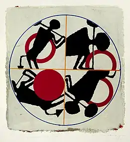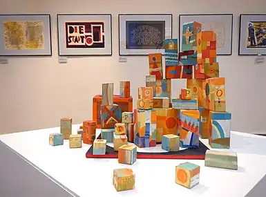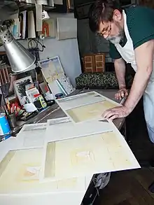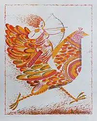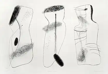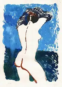 Over recent years, he has been occupied with private interior design, fresco wall painting, colour relief. The artist works in printed graphic technics: lithography, etching, serigraphy, and linocut.[2]