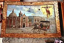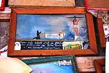 Past Mexican artists such as Frida Kahlo, Roberto Montenegro, Diego Rivera, Juan O'Gorman and David Alfaro Siqueiros have used elements of these paintings in their own work.[2][4] The influence of ex votos is very clear in Frida Kahlo's Portrait of Wilhelm Kahlo, in which she writes about her father in text under his portrait, separated by a line.[2] Today, individual artists from diverse cultural backgrounds draw creative inspiration from this popular art form.[5] One such artist is Francisco Larios Osuna who creates painting in the votive form to document events from his own life as well as the lives of people he knows. However, unlike traditional votive paintings, these works are created by and for the artists and not for the subject of the piece. His work has been commissioned by the Mexican government and can be seen in the consulates located in Los Angeles, Miami, Houston and Brownsville .[12] Another area where the influence of votive paintings can be seen in mural work and other art in the west and southwest United States.[4]