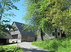 • The farm at house no. 1 consists of a stone house built into the hill with an arched stone door casing bearing the year 1841 and a votive niche above this, a barn with a loft covered with a steep gabled roof, and a double hayrack with a votive niche in its stone column. It stands along the road to Three Kings' Peak, east of Jereb Hill (Slovene: Jerebov grič).[14]
