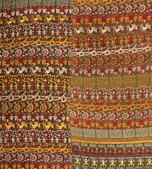 Assamese silk weavers depicted scenes from Bhagavatha, Mahabharatha, mainly of the childhood days of Lord Krishalala on silk clothes under the supervision of Saint, scholar, and poet Srimanta Sankardeva and his disciple Madhvadeva during 16th Century.[3] First woven between 1567 and 1569, it was taken to Bhutan and then later to Tibet, where European merchants brought it back to Europe. Presently, it is owned by the Victoria and Albert Museum in London and the Musee Guimet in Paris.[1] Some reports suggest that the Vrindavani Vastra piece was collected by a reporter of "The Times" (London) and donated to the museum [3] around 1904.[2] Similar silk drapes are also held by other museums like The Philadelphia Museum of Art.[4] In 2004, a similar piece of silk drape, probably designed by Sankaradeva during 16th Century, was put up for auction by the auction house of Christie's in New York, with a reserve price of $120,000.[5] This type of silken-weaving artwork was produced up to around 1715 in Assam and its neighborhood[6] and exported to places like Tibet.[1]