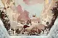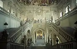 Under the rule of Prince-Bishop Anselm Franz von Ingelheim (1746–49), all building work on the Residence ceased once again.[3] After his death, once Karl Philipp von Greifenclau zu Vollraths (1749–54) became Prince-Bishop, he ordered a resumption of construction. In the same year, Antonio Bossi completed the stucco-work in the Garden Hall, the painting of which was finished in the next year. In 1750, Lorenz Jakob Mehling, a merchant at Venice, sent Giovanni Battista Tiepolo to the bishopric residence, after the painter Giuseppe Visconti had failed.[4] Giovanni Battista Tiepolo, assisted by his sons, decorated the Imperial Hall and the ceiling above the staircase with frescoes in the early 1750s. In 1753, Balthasar Neumann died.[3]