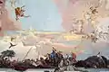 This fresco, the largest in the world,[1]: 55 created from 1750 to 1753 by Venetian painter Giovanni Battista Tiepolo shows paintings of the four continents: Europe, America, Asia and Africa. Each continent is represented by a typical landscape and animals (or the painter's vision of these animals) and a female allegorical figure. Europe holds a sceptre, is symbolized by a bull, and has a boy playing with a cannon. America has natives with feathers, who practice cannibalism of prisoners, and a crocodile. Asia has a tiger and elephant, the crosses of Golgotha are visible in the background. Africans have a camel, and a caravan of turbanned Magi. Tiepolo was helped in his labors by his son Giandomenico and the stuccoist Antonio Bossi.[7] There is also a picture of the Prince-Bishop with Mercury approaching from Olympus while Apollo launches the sun horses, surrounded by incarnations of the stars. The fresco also shows Tiepolo himself (in the southwest corner) and Neumann, in the center of the southern front, leaning on a cannon.[1]: 55
