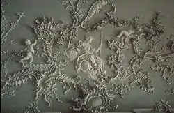 The Weisser Saal or White Hall in Rococo style was the audience chamber and is dominated by the stucco decorations of Antonio Bossi.[1]: 55 The white stucco works on a light gray background are composed of a large quantity of rocailles, mixed with images of real items, especially of military purpose.
