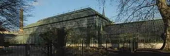 300 ft. long, 45 ft. wide and 50 ft. high, the building is fully glazed on the roof and the south face, while the north face is walled up. With a total floor space of 14,000 sq. ft., the interior is divided lengthwise into three sections; there are two annexes to the central section, namely a plant-rich east wing which serves as the entrance hall, and a west wing used as a coldhouse.
