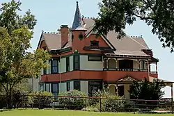 The Strain House is an example of late Victorian architecture. It was designed by J. E. Flanders & Moad of Dallas. This firm also designed the Trinity Methodist Church in Dallas, and the Shackelford County Courthouse, which is part of an historic district in Albany, Texas.[2] Joe Lyon built the house in 1896. The 2+12-story frame structure includes a gabled wood-shingle roof, and the brick foundation has an asymmetrical plan.