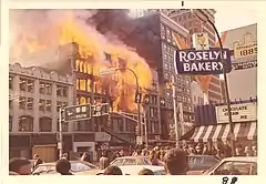 ![]() The W.T. Grant building ablaze, with the Thomas Building (grey) and the Merchants Bank Building (red) in the background. | |