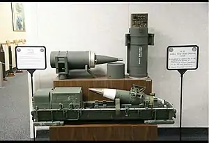 Originally envisioned as a dual-purpose weapon, with interchangeable components to allow the shell to function as either a standard fission explosive or an enhanced radiation device, the warhead was developed at Lawrence Livermore Laboratory[1] starting in 1977. The eventual prototype round had a yield of 2 kt (8.4 TJ) in a package 34 inches (860 mm) long and weighing 95 pounds (43 kg),[1] which included the rocket-assisted portion of the shell. The unit cost of the weapon was estimated at US$4 million.[2]:93 Although enhanced radiation devices were considered more effective at blunting an invasion due to the high neutron flux they produce, the more complex design eventually led to the cancellation of the dual-purpose W82-0 program in 1982. Development of a standard weapon, the W82-1, was restarted in 1986. The program was finally cancelled in 1991 due to the end of the Cold War.