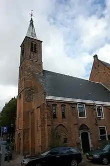 The Waalse kerk is a Walloon church that was built in the middle of the 14th century and has an upper gallery built for the Beguines who lived there on the courtyard that still bears their name.[1] The sacristy dates from the 16th century, with wooden arches and a mantel from the 17th century.[1] The organ was built in 1808 by Friederichs, and in the attic there is a mechanical clock that drives the hands on the clock of the organ.[1] In the church tower there is a bell from 1512 with a diameter of 56.5 centimeters.[1]