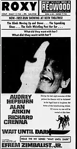 Wait Until Dark is a 1967 American psychological thriller film directed by Terence Young and produced by Mel Ferrer,[3] from a screenplay by Robert Carrington and Jane-Howard Carrington, based on the 1966 play of the same name by Frederick Knott.[4] The film stars Audrey Hepburn as a blind woman, Alan Arkin as a violent criminal searching for drugs, and Richard Crenna as another criminal, supported by Jack Weston, Julie Herrod, and Efrem Zimbalist Jr.[5]