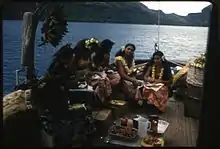 Lobster lunch aboard the research vessel Mureva, with dancers from Bora Bora. Photo from Schmitt's Smithsonian-Bredin Expedition, 1956.
