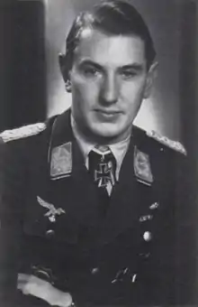 He was promoted to Major and took command of NJG 5 as Geschwaderkommodore (wing commander) on 15 March, succeeding Egmont Prinz zur Lippe-Weißenfeld.[5] He received the Knight's Cross of the Iron Cross (Ritterkreuz des Eisernen Kreuzes) on 27 July 1944 by which time he had achieved 45 aerial victories in total.[1]