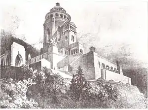 The Monument to Peace and Alliance stood out; it was conceived to be built on the side of a hill at the border between Bohemia and Saxony, in homage to the unity between Germany and Austria-Hungary. The model appears in photographs published in newspapers,[13][29] in the poster designed by the architect Otto Polak for the exhibition[Note 2] and in a charcoal perspective by Reinhold Völkel.[29] The great central tower of the mausoleum is surrounded by terraces and galleries, decorated with sculptural groups on pilasters, of two of which Lenck exhibited plaster models.[12][29]