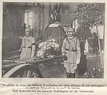 Waddington's funeral was attended by many generals and other officers. The honour guard was provided by his entire cavalry brigade together with detachments of troops from the rest of the French Army of the Rhine, flags and standards were flown veiled in black crepe. Those present included chairman of the Inter-Allied Rhineland High Commission, Paul Tirard; commander of the French Army of the Rhine, General Jean Degoutte and generals Georges Demetz and Henri Mordacq (together with at least eleven other French generals). There were delegations from the Belgian, British and American armies as well as Roman Catholic and Jewish chaplains.[8] Degoutte spoke of Waddington as a brilliant military leader and close friend who had served with him in Madagascar and whose untimely death had cut short a promising military career.[12]