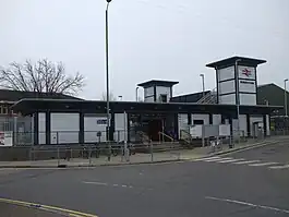 Waltham Cross railway station is on the West Anglia Main Line, serving the suburban town of Waltham Cross in Hertfordshire, and the neighbouring Waltham Abbey in Essex, England. It is 12 miles 63 chains (20.6 km) down the line from London Liverpool Street and is situated between Enfield Lock and Cheshunt. Its three-letter station code is WLC and it is in Travelcard zone 7.
