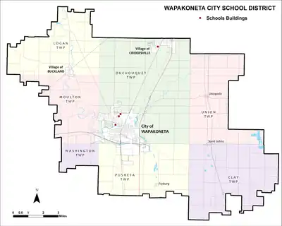 The district encompasses the city of Wapakoneta; the villages of Buckland and Cridersville, the unincorporated communities of Fryburg, Saint Johns, and Uniopolis; Duchouquet Township; as well as parts of Clay, Logan, Moulton, Pusheta, Union, and Washington Townships. The district enrolls approximately 3,000 students.
