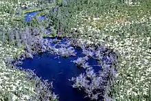 The park was set up to protect the environment and the Cree traditions. It is a young landscape formed by erosion from the last glacial period, which forms many subarctic habitats.[7] Evidence of this is seen from the glacial features like moraines, eskers and strand lines left by moving glaciers.[13] This glaciation resulted in environments like far extending beaches and plains dipping towards Hudson Bay.[13] The geography consists of coastal tundra habitats with coastal marshes, beach ridges and freshwater sedges which make up the habitats there.[14] The climate here is subarctic and wet, having many rivers and bogs called "Muskeg" by the indigenous Cree people native to that area.[13] In terms of ecology, Wapusk's location is part of the Hudson Plains ecozone.[7]