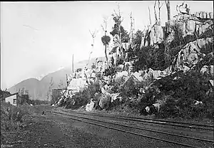 A stationmaster's house was designed in 1895, though there seems to be no mention of it being built. From 1897 to 1899 there was a caretaker at Waro. Railway houses were built in 1894 and 1898. By 1897 the station had a shelter shed, passenger platform and sidings to several coal mines and limestone quarries.[6] Hikurangi Coal and Northern Coal had sidings between Waro and Otonga in 1911.[7] In 1916 there was concern about the danger to the railway from blasting at the Dominion Cement quarry,[6] had 20acres at Waro to extract white limestone.[8] and had been further enlarged by Wilsons Portland Cement by 1926.[9] Waro Mine produced 681,905 tons of coal, mainly for Wilson's Portland Cement,[10] but flooding brought about closure of the mines in the 1930s.[11] The sidings to the limestone quarries were still in use in 1964.[6] Waro station closed on 12 March 1972.[12]