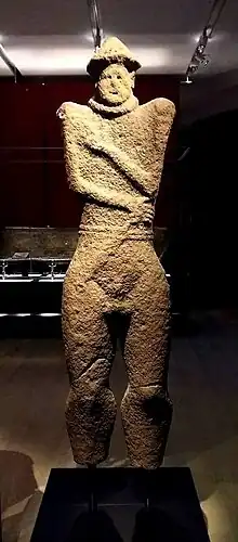 The Warrior of Hirschlanden (Krieger von Hirschlanden in German) is a statue of a nude ithyphallic warrior made of sandstone, the oldest known Iron Age life-size anthropomorphic statue north of the Alps. It was a production of the Hallstatt culture, probably dating to the 6th century BC. It is now in the Württembergisches Landesmuseum in Stuttgart, with a copy at the Hirschlanden site (now Ditzingen, Baden-Württemberg, Germany), where it was found. The preserved height is 1.50 m, but the feet have been broken off.