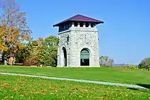 In 1850, it was acquired by the State of New York and became the first publicly operated historic site in the country.[3] Today, it is a museum furnished to recreate its condition during the Revolutionary War. It covers an area of about seven acres (2.8 ha), with three buildings: Hasbrouck House, a museum (built in 1910), a monument named the "Tower of Victory", which was completed in 1887 in commemoration of the centennial of successful disbandment of the Continental Army, and a maintenance shed/garage built in the Colonial Revival style in 1942.[3]