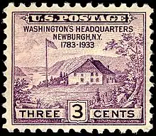 On July 4, 1850 Major General Winfield Scott raised a flag at the opening ceremony and dedication for Washington's headquarters.[18] The U.S. Post Office issued a commemorative stamp featuring an accurate depiction of Washington's Headquarters at Hasbrouck House, overlooking the Hudson River, at Newburgh, New York, on April 19, 1933, the 150th anniversary of the Proclamation of Peace.[17]
