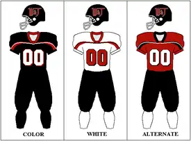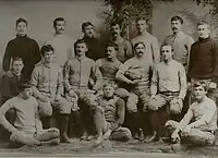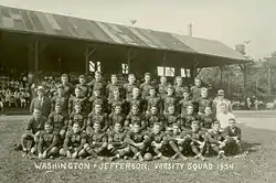 At the same time its activities were becoming more scrutinized, the football team became more successful. The season finale in 1896 at Exposition Park in Pittsburgh was one of the largest crowds in western Pennsylvania history, when an overflow crowd of 12,000 watched W&J defeat Duquesne Country and Athletic Club 4–0.[12] But it was the September 29, 1897, game against the University of Pennsylvania Quakers that marked the "birth of big-time football" at W&J.[12] The Red and Black lost 18–4 to the eventual national champions, but W&J counted it a moral victory, since they were missing 4 of their 11 starters due to new eligibility requirements.[12] In a game against Denison University on Sept. 19, 1908, W&J became the first college football team in history to wear numbered uniforms.[13][14]