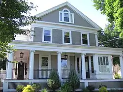 The Washington Damon House is a historic house in Reading, Massachusetts, exhibiting the adaptation of existing housing stock to new architectural style. The 2+12-story wood-frame house was built in 1839, and was at the time a fairly conventional side hall Greek Revival house, although it has small wings on either side that also appear date to that period. It was significantly renovated in 1906, when the wraparound porch was added, as was the Palladian window in the front gable end. When made, these additions included Greek Revival elements that were sensitive to those already present on the structure.[2]