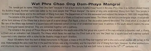 Wat Phaya Mangrai (Thai: วัดพญามังราย; "Temple of King Mangrai") is a ruined temple located within the Wiang Kum Kam archaeological site, very close to the south-eastern side of Wat Phrachao Ong Dam. It is named after the historic figure Mangrai the Great.