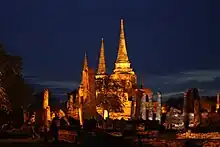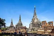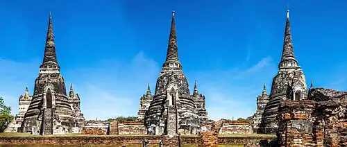 Wat Phra Si Sanphet (Thai: วัดพระศรีสรรเพชญ์; "Temple of the Holy, Splendid Omniscient") was the holiest temple on the site of the old Royal Palace in Thailand's ancient capital of Ayutthaya until the city was completely destroyed by the Burmese in 1767, during the Burmese–Siamese War.[1] It was the grandest[2] and most beautiful temple in the capital and it served as a model for Wat Phra Kaew in Bangkok.
