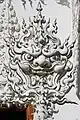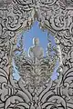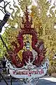 The principal building, the ubosot, is an all-white building with fragments of mirrored glass embedded in its exterior. It embodies design elements from classic Thai architecture, such as the three-tiered roof and abundant use of Nāga serpents.[5] "Inside the temple, the decor swiftly moves from pristine white to fiery and bewildering. Murals depict swirling orange flames and demon faces, interspersed with Western idols such as Michael Jackson, Neo from The Matrix, Freddy Krueger, and a T-800 series Terminator. Images of nuclear warfare, terrorist attacks such as the World Trade Center attack, and oil pumps hammer home the destructive impact that humans have had on earth. The presence of Harry Potter, Superman, and Hello Kitty confuses the message somewhat, but the overall moral is clear: people are wicked.[8]