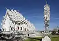 The main building at the white temple, the ubosot, is reached by crossing a bridge over a small lake. In front of the bridge are hundreds of outreaching hands that symbolize unrestrained desire. The bridge proclaims that the way to happiness is by foregoing temptation, greed, and desire. Next to the lake stand two very elegant Kinnaree, half-human, half-bird creatures from Buddhist mythology.[5]