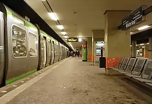 Waterloo is a Hanover Stadtbahn station served by lines 3, 7 and 9. South of here the lines branch off: lines 3 and 7 turn south in order to travel towards Wallensteinstraße and Wettbergen, while line 9 keeps west towards the centre of Hannover-Linden in order to reach Empelde. The station has four tracks to prevent simultaneously arriving trains from Empelde and Wettbergen from having to wait in the tunnel: see below for the layout. It was named for the Battle of Waterloo. The station was opened as the first underground Stadtbahn station in Hanover and renovated in 2014. The walls and columns now display images and information about the history of Hanover.
