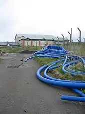 The flat topped bungalows at 28 to 30 Main Street were designed by Sam Brunton and built using new prefabrication techniques in 1943 from gyproc.[1] Hareshawmuir Lodge was originally built as an Edwardian shooting lodge, however it has been much modified.[1] It was the property of the Earl of Glasgow in 1867 and had been so since 1687. The tract of land in this areas was also known as Harelaw or Hartshaw.[4] Amlaird lies on the A719 and is a water filtration plant that treats water from the Lochgoin Reservoir, created in 1910 by the Kilmarnock Corporation from the ancient Loch Goyne.[5]
