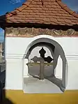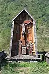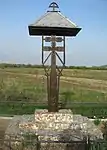 Often, the crosses are surrounded by a shelter, with a door towards the road and windows at the sides. Travelers hit by rainstorms can wait inside. In the past, where the water source was farther away, villagers would leave a pitcher of fresh water for passersby. Shelters are rarer in hay and mountain areas; the crosses there are usually covered by tile roofs.[4] The shelters, which form a sort of chapel, are usually painted on the exterior and interior. Christ Pantocrator or the Trinity is on the ceiling, flanked by the Four Evangelists, angels or prophets. Saints and angels are found lower down, with empty spaces filled by grape leaves, ears of wheat, floral or geometric patterns. The exterior might feature medallions of saints or Biblical scenes. Inscriptions appear painted on the inside or carved into the cross.[5]