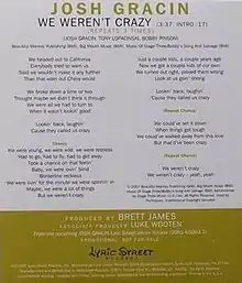 1. Malec, Jim (October 9, 2007). "Josh Gracin - "We Weren't Crazy"". The 9513. Archived from the original on October 28, 2007. Retrieved July 30, 2008.