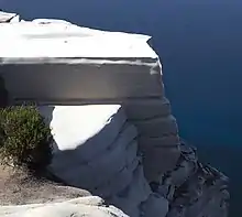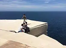 Wedding Cake Rock earned its name from its resemblance to a slice of a wedding cake; the feature shows layers and is unusually eroded into a perfectly cuboid shape, in addition to being white, similar to a wedding cake. The feature is one of many formations between Bundeena and Marley Beach, including The Balcony (Bundeena Lookout) and the adjacent "White Cliffs" of Marley.[1] Before its closure from the public, travellers to Wedding Cake Rock were often advised not to stand near the edge of the cliff, mainly due to regularly strong winds.[2] The rock can be reached by the Royal National Park Coast Track, a walking trail through the park that spans the entire length of the park's coastline, from Bundeena to Otford. Wedding Cake Rock is situated 5.1 kilometres (3.2 mi) from the start of the trail at Bundeena.[3]