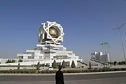 The eleven-story building covers an area of over 38,000 square metres (410,000 sq ft). It is a three-tier structure, each side of which has the form of an eight-pointed star. A cube that towers over large columns forms its upper stage and incorporates a ball with a diameter of 32 meters—a symbolic planet Earth with the image of Turkmenistan. Four entrances to the building symbolize the four directions.